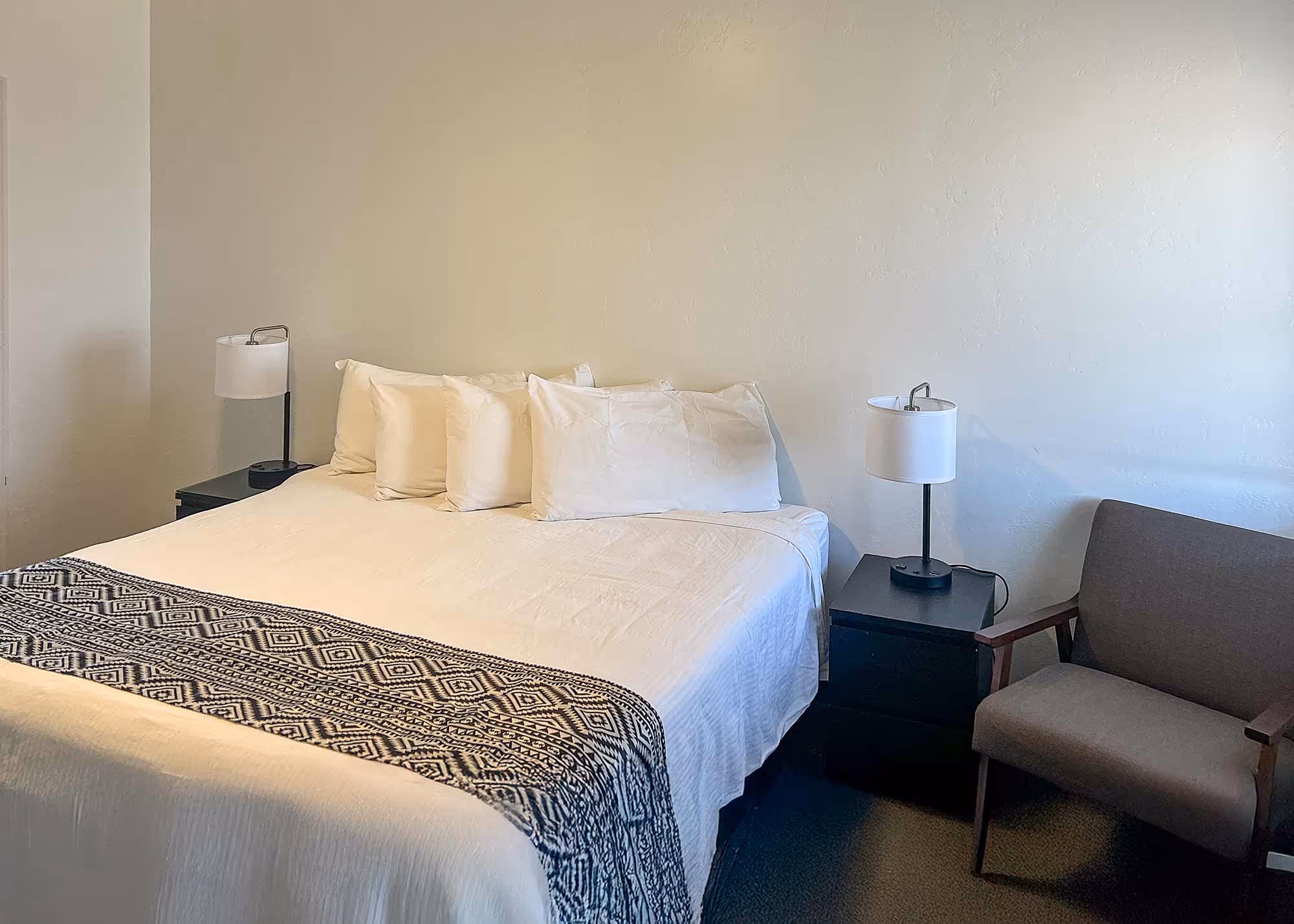 Our King Rooms offer a spacious retreat for solo travelers or couples, featuring one comfortable king bed and modern updates from a 2023 remodel. Each room includes a microwave, mini fridge, coffee maker, and hair dryer, along with private climate-control, a flat-screen TV, and free Wi-Fi. All rooms are non-smoking.